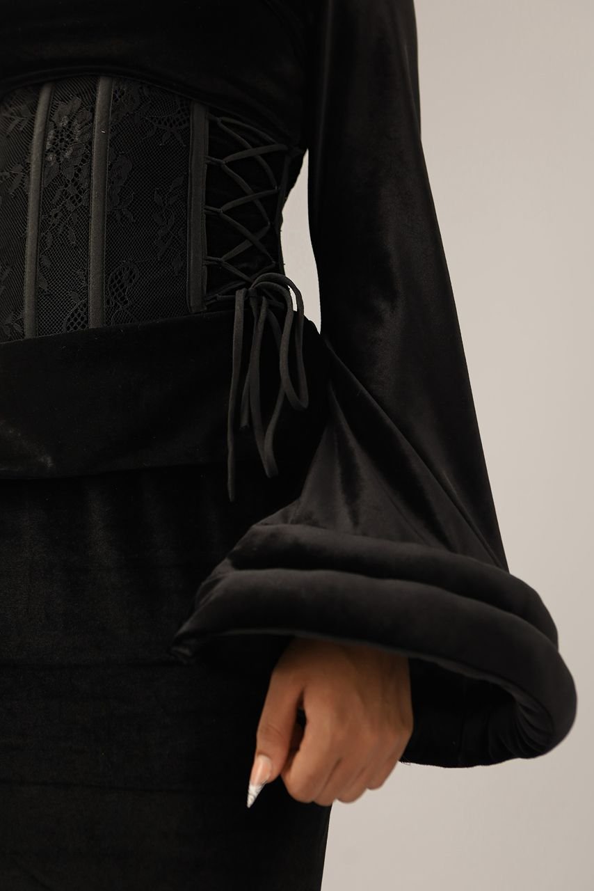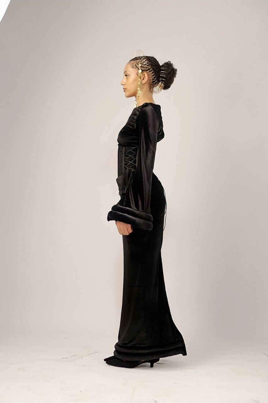 An elegant black velvety dress… quiet, composed, and arresting. Features a corset band with soft cuffs on sleeves.